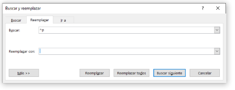 • En la casilla “Buscar:” escriba ^p (Alt 94 + p). (^p: Representan el símbolo “ ¶ “, correspondiente al salto de punto aparte).