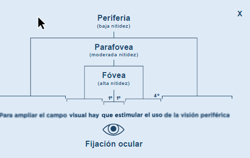 El ojo humano es el órgano que detecta la luz, su función consiste en transformar la energía lumínica en señales eléctricas que son enviadas al cerebro a través del nervio óptico. Podemos diferenciar en las tres zonas visuales, la fóvea, la parafovea y la periferia. El factor diferenciador de cada una se basa en el grado de nitidez, siendo la fovea la que mayor grado de claridad consigue y por lo consecuente la que interpreta la imagen.